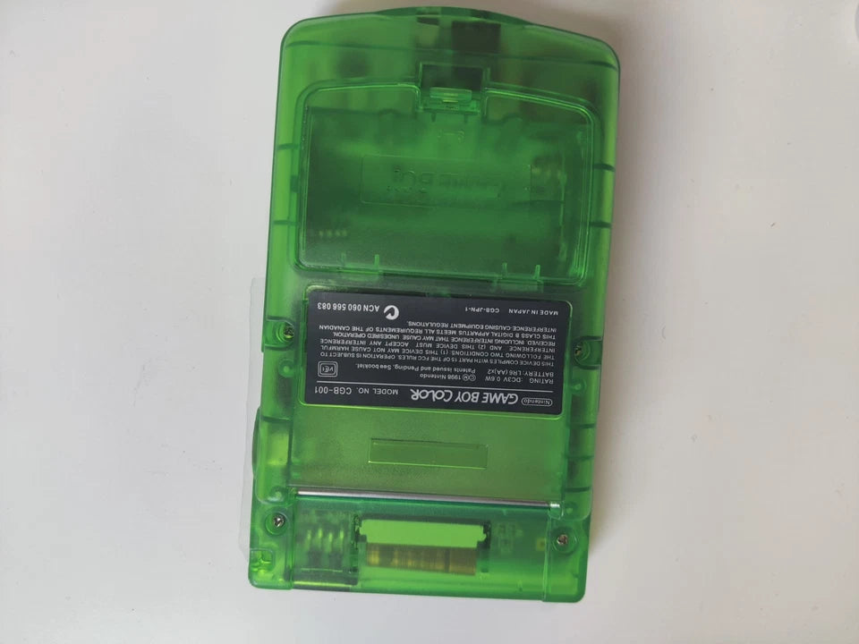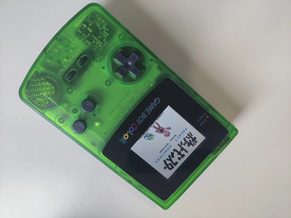 Authentic Nintendo Game Boy Color console in rare clear green shell, upgraded with bright IPS backlit display. Fully tested, clean condition, smooth buttons, perfect for collectors and gamers.